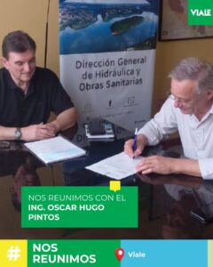 El Presidente Municipal, Dr. Carlos Weiss, mantuvo una reunión con el Director General de Hidráulica y Obras Sanitarias de Entre Ríos (DGHyOS), Ing. Oscar Hugo Pintos, en la que el funcionario provincial entrego el proyecto elaborado por la Dirección General de Hidráulica y Obras Sanitarias, denominado “Sistematización del Arroyo Teodoro Ríos”, correspondiente al tramo comprendido entre Av. Presidente Perón y calle Rocamora.