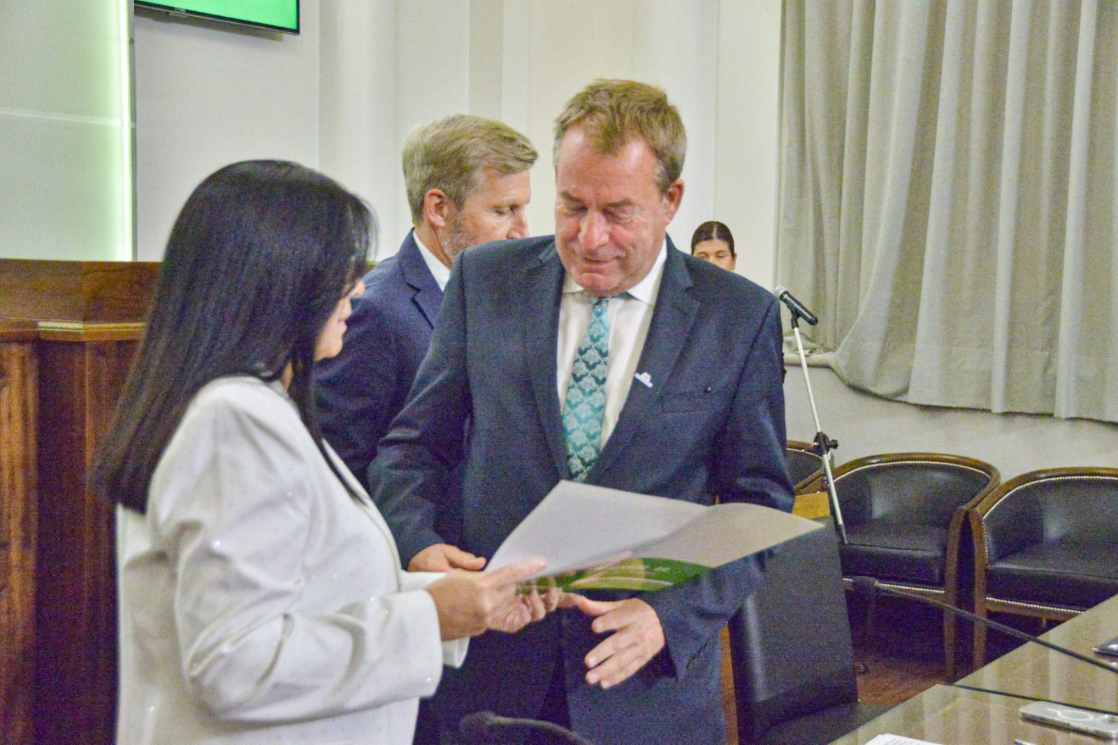 La vicegobernadora y presidenta del cuerpo, Alicia Aluani, les dio la bienvenida a los presentes y en su discurso expresó el reconocimiento a la comunidad alemana y a los lazos históricos que unen a ambos pueblos. Destacó el aporte decisivo de esta comunidad al desarrollo cultural, económico y social de Entre Ríos, un legado que permanece en sus instituciones y, sobre todo, en valores como el trabajo, el compromiso y la solidaridad.