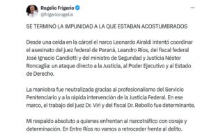 En un operativo conjunto de máxima seguridad, la Justicia Federal logró desbaratar un plan de sicariato orquestado desde el interior de la Unidad Penal N° 9 de Gualeguaychú. Frigerio manifestó su respaldo absoluto al trabajo realizado y afirmó: «En Entre Ríos no vamos a retroceder frente al delito».