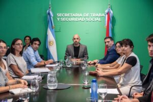 El encuentro fue encabezado por el secretario de Trabajo, Mariano Camoirano; el presidente del Consejo General de Educación (CGE), Carlos Cuenca y la secretaria de Hacienda, Mariela Volpe, junto a representantes gremiales.