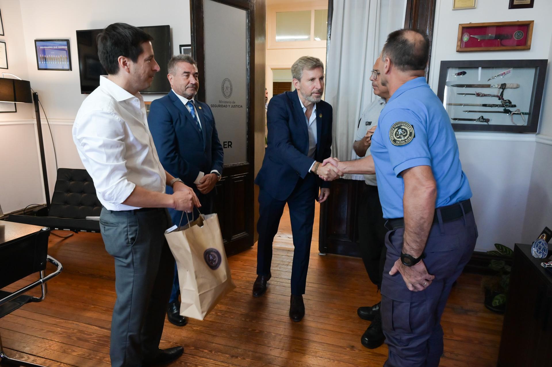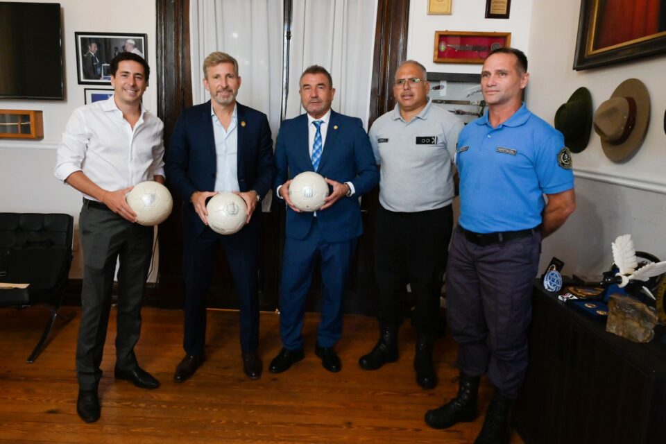 En este marco, se hizo la entrega simbólica de una pelota de fútbol marca Torreón al gobernador Rogelio Frigerio; al secretario general de la Gobernación, Mauricio Colello; y al ministro de Seguridad y Justicia, Néstor Roncaglia.