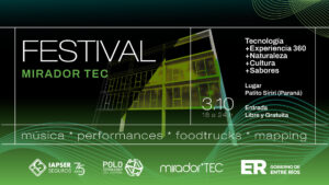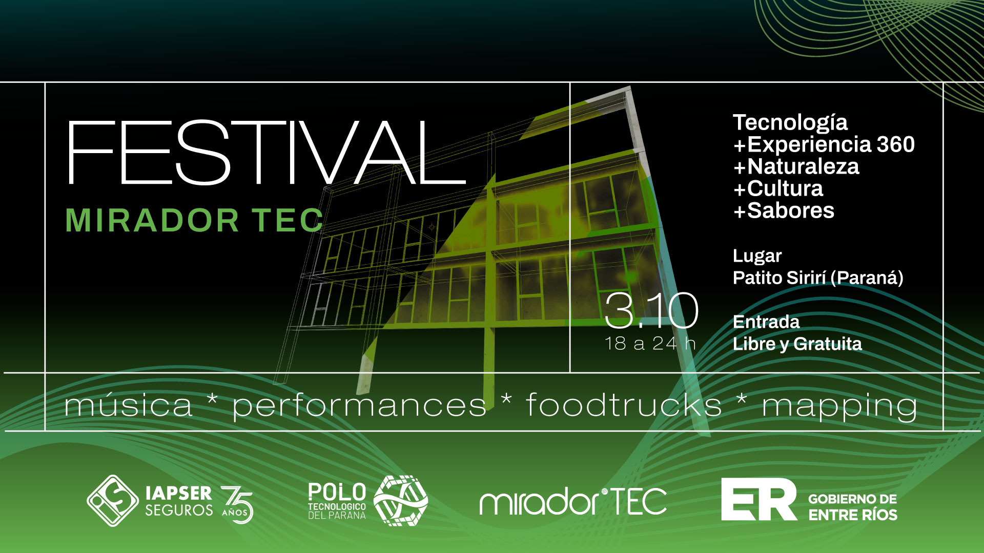 El Gobierno de Entre Ríos invita al Festival Mirador TEC, un encuentro de cultura, innovación y tecnología que se realizará el 3 de octubre desde las 18 en el parque Patito Sirirí de Paraná, con entrada libre y gratuita. Será una experiencia 360 al aire libre que combinará música en vivo, video mapping, performances artísticas y sabores.