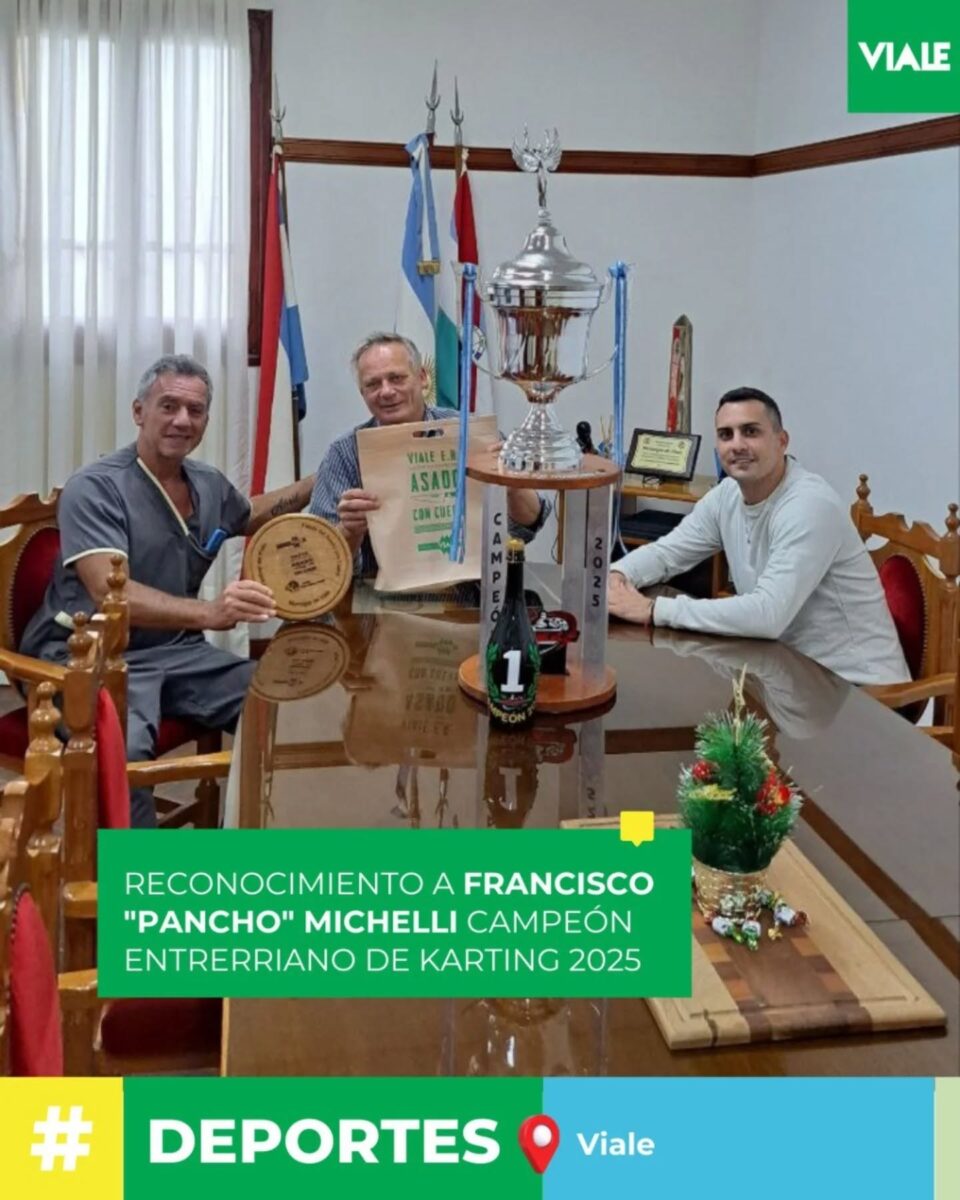 El Presidente Municipal, Dr. Carlos Weiss, junto al Director de Deportes, Prof. Adrián Fontana, recibieron a Francisco «Pancho» Michelli, quien se consagró campeón del Campeonato Entrerriano de Karting 2025, tras imponerse en la serie y la final de la categoría 150 Master C.