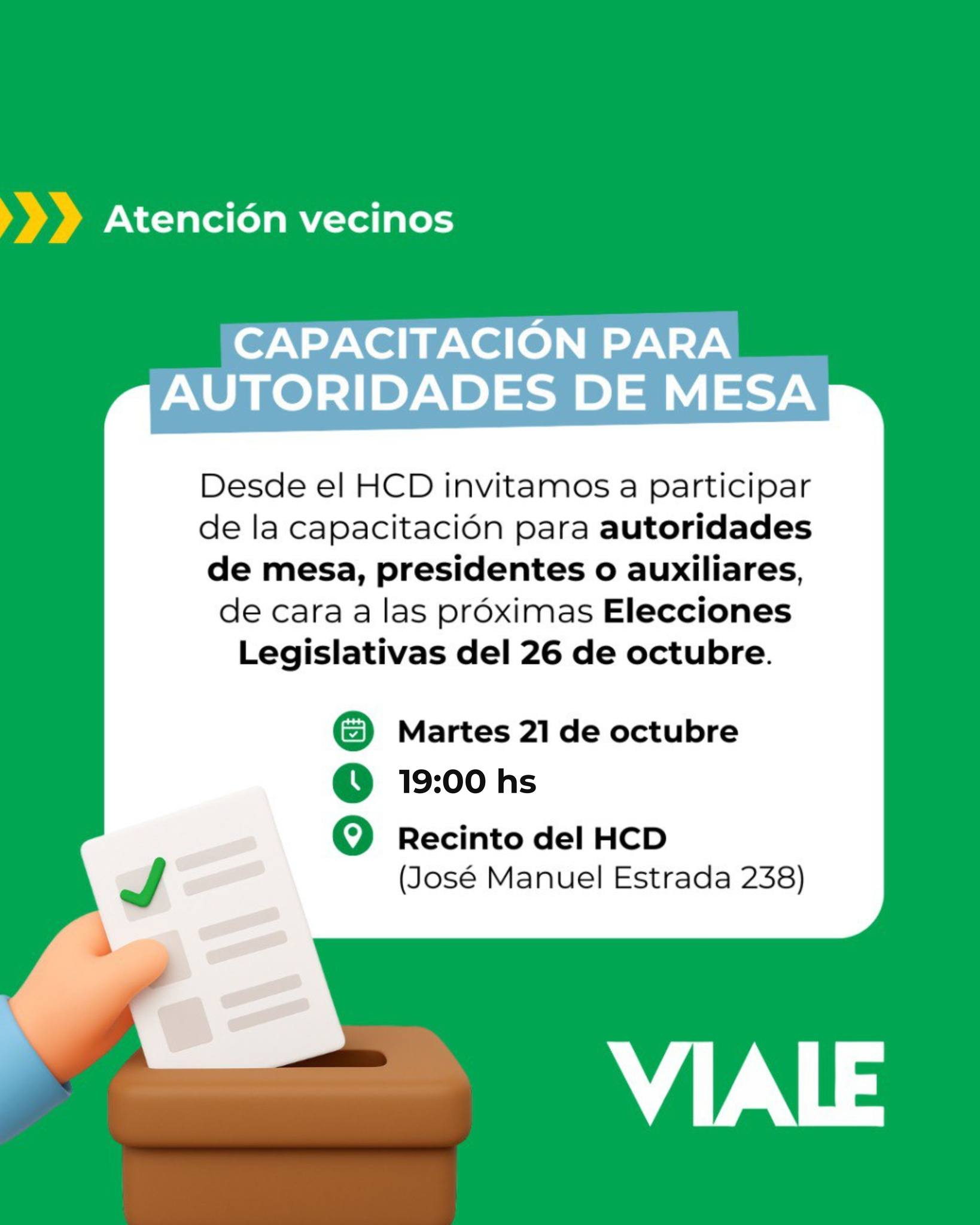 Desde el Honorable Concejo Deliberante de Viale invitamos a participar de la capacitación para autoridades de mesa, presidentes o auxiliares, de cara a las próximas Elecciones Legislativas del 26 de octubre.